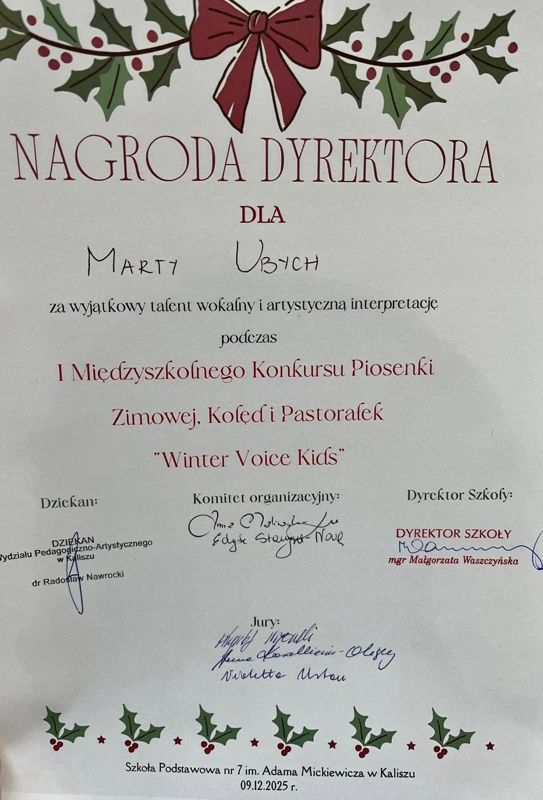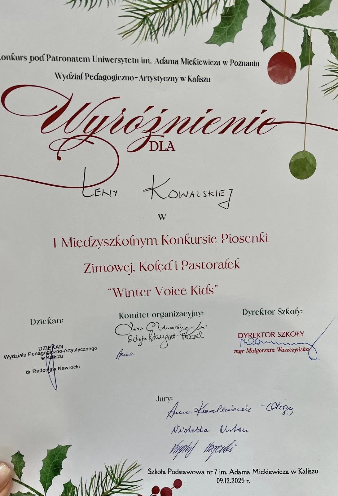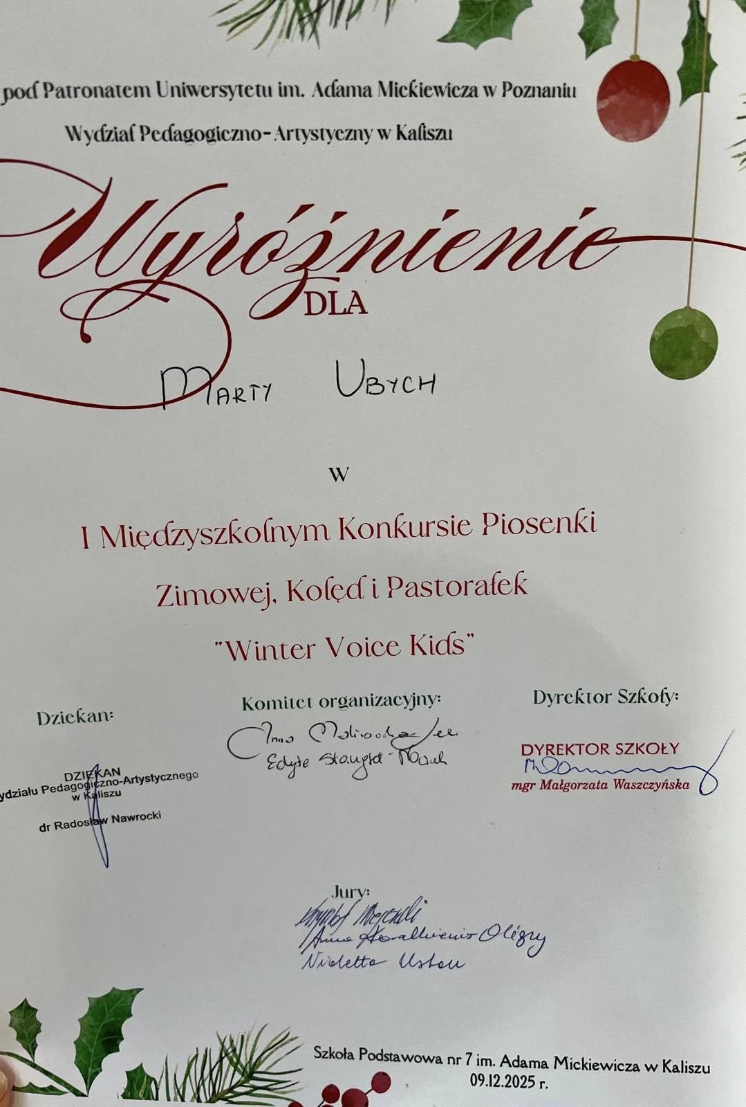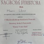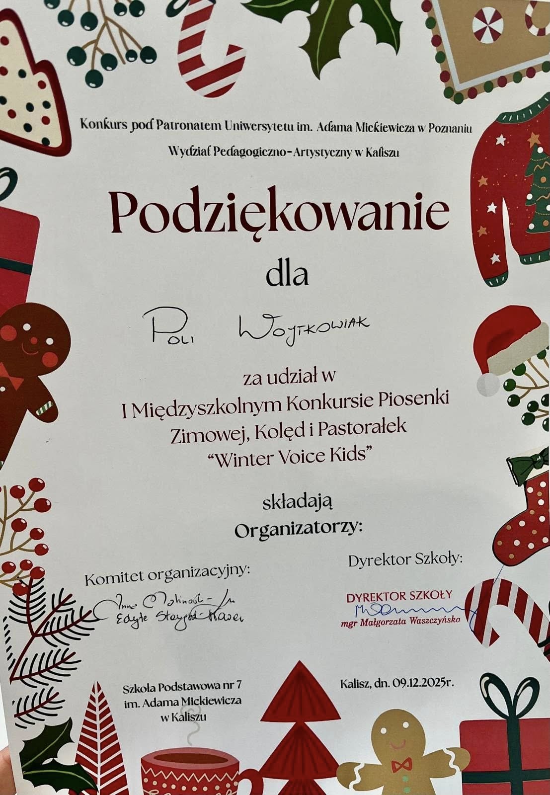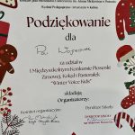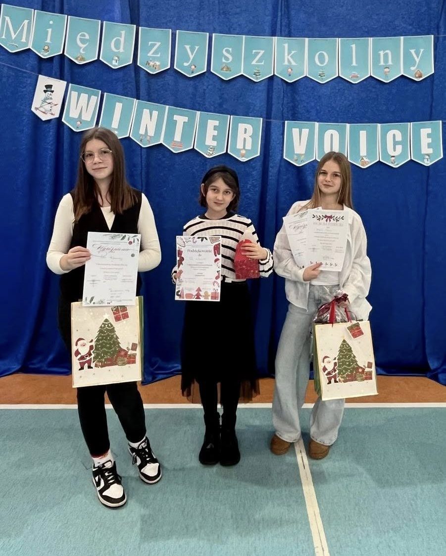 Z radością informujemy, że uczennice naszej szkoły: Lena Kowalska z kl. 4 , Pola Wojtkowiak z kl. 4 oraz Marta Ubych z kl. 8 wzięły udział w finale I Międzyszkolnego Konkursu Piosenki Zimowej, Kolęd i Pastorałek „Winter Voice Kids”. Nasze młode artystki zaprezentowały się wspaniale i zostały wyróżnione przez jury za swoje piękne i pełne emocji wykonania. Specjalną Nagrodę Dyrektora otrzymała Marta Ubych – serdecznie gratulujemy tego wyjątkowego osiągnięcia! Jesteśmy dumni z talentu, odwagi i zaangażowania wszystkich uczestniczek. Brawo dziewczyny!