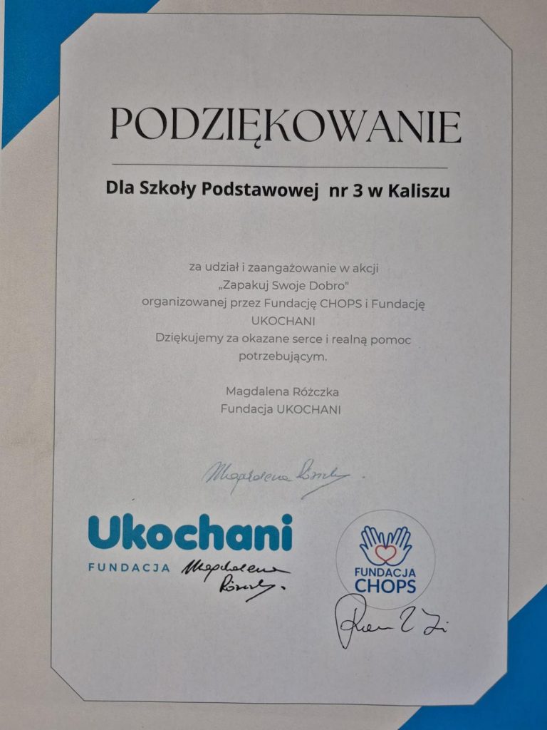 Zakończyliśmy akcję „Herbatka dla Babci i Dziadka”! Z ogromną radością informujemy, że nasza szkolna zbiórka dla seniorów odniosła wielki sukces! Dzięki zaangażowaniu uczniów, rodziców i nauczycieli udało się zebrać mnóstwo pięknych darów: herbat, kaw, słodyczy, ciepłych szalików, rękawiczek i innych upominków. Dziś Panie z Dziennego Domu Pomocy Społecznej w Kaliszu odwiedziły naszą szkołę, aby odebrać […]