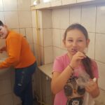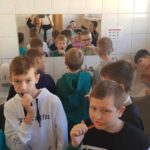 Uczniowie z ciekawością wysłuchali pogadanki na temat właściwej higieny jamy ustnej. Dowiedzieli się, czym jest próchnica, dlaczego psują się zęby oraz jak należy prawidłowo je czyścić. Ogromną atrakcją były ćwiczenia praktyczne na eksponacie sztucznej szczęki. Początkowo dzieci przyglądały się czynnościom wykonywanym przez panią Kingę, a następnie według jej wskazówek naśladowały szczotkowanie zębów. Pani stomatolog przypomniała również uczniom o potrzebie wizyt kontrolnych, a także o konieczności właściwego odżywiania się.