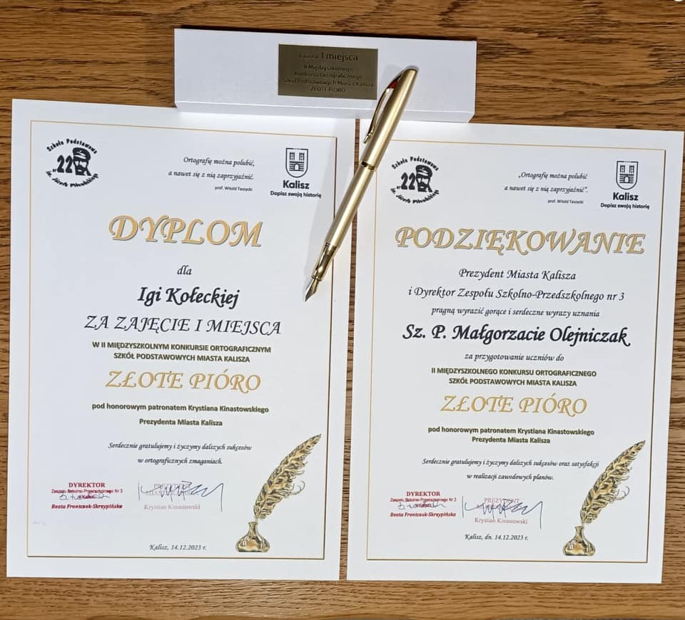 Z ogromną przyjemnością informujemy, że pierwsze miejsce w II Międzyszkolnym Konkursie Ortograficznym Szkół Podstawowych Miasta Kalisza „Złote Pióro”, który odbywał się pod patronatem Krystiana Kinastowskiego – Prezydenta Miasta Kalisza zajęła Iga Kołecka z klasy 7a.