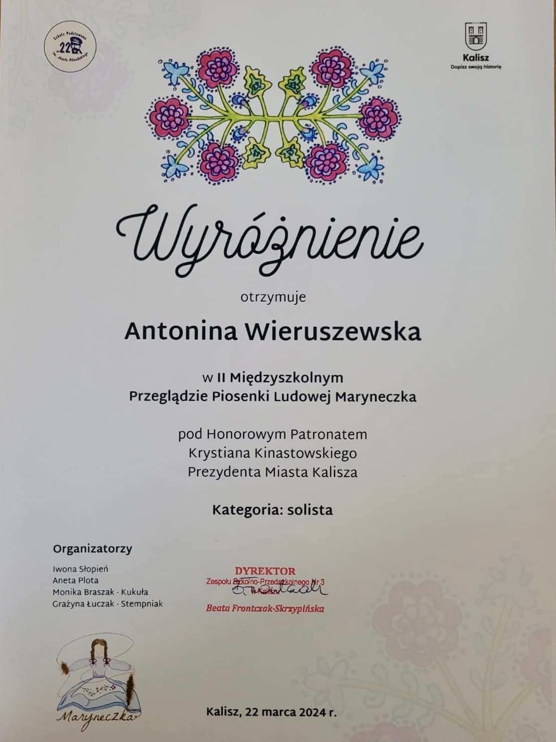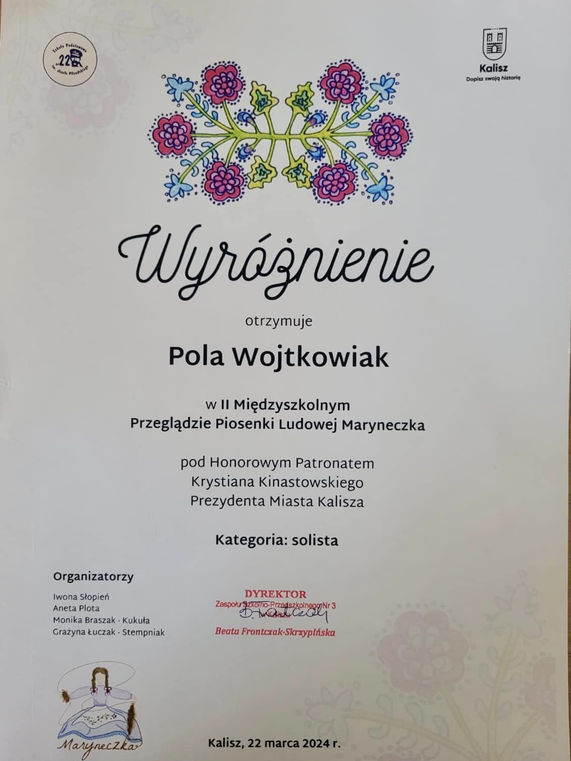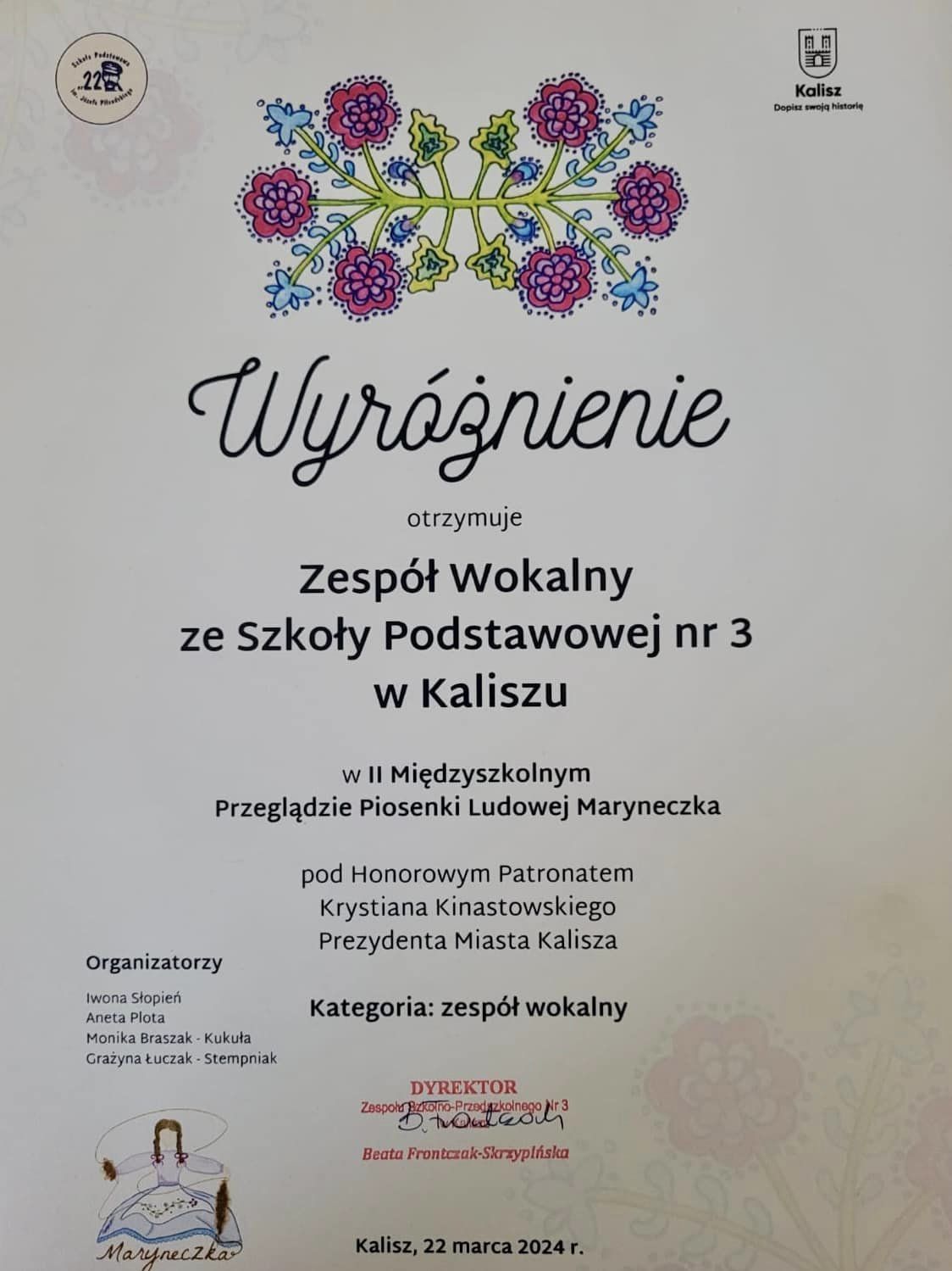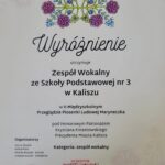 W dniu 22.03.2024r. uczennice: Antonina Wieruszewska (3b), Pola Wojtkowiak (2a) oraz dziewczynki z Zespołu Wokalnego Szkoły Podstawowej nr 3 w składzie: Amelia Światła, Lena Kowalska (2a) oraz Julia Michalska i Weronika Berczyńska (2b) reprezentowały naszą szkołę na II Międzyszkolnym Przeglądzie Piosenki Ludowej ,,Maryneczka” pod Honorowym Patronatem Prezydenta Miasta Kalisza, Krystiana Kinastowskiego w Zespole Szkolno-Przedszkolnym nr 3 w Kaliszu. Uczestnicy wystąpili w trzech kategoriach: solista, zespół wokalny oraz zespół wokalno-taneczny. Poziom artystyczny tego wydarzenia był bardzo wysoki, a nasze dzielne uczennice sprostały temu wyzwaniu. Zarówno naszym reprezentantkom, jak i pozostałym uczestnikom, którzy wywodzili się ze szkół kaliskich oraz podkaliskich, życzymy samych muzycznych sukcesów.