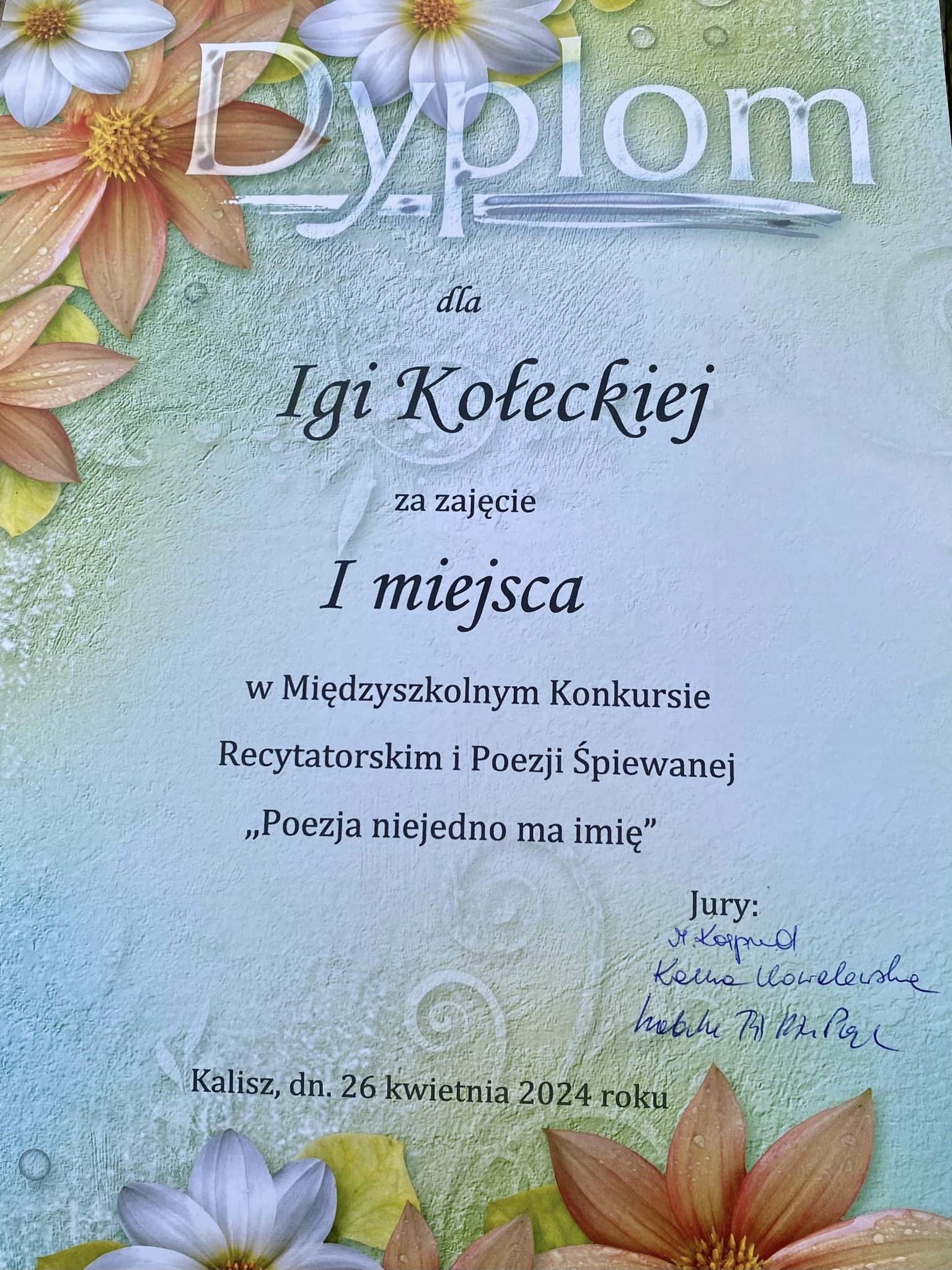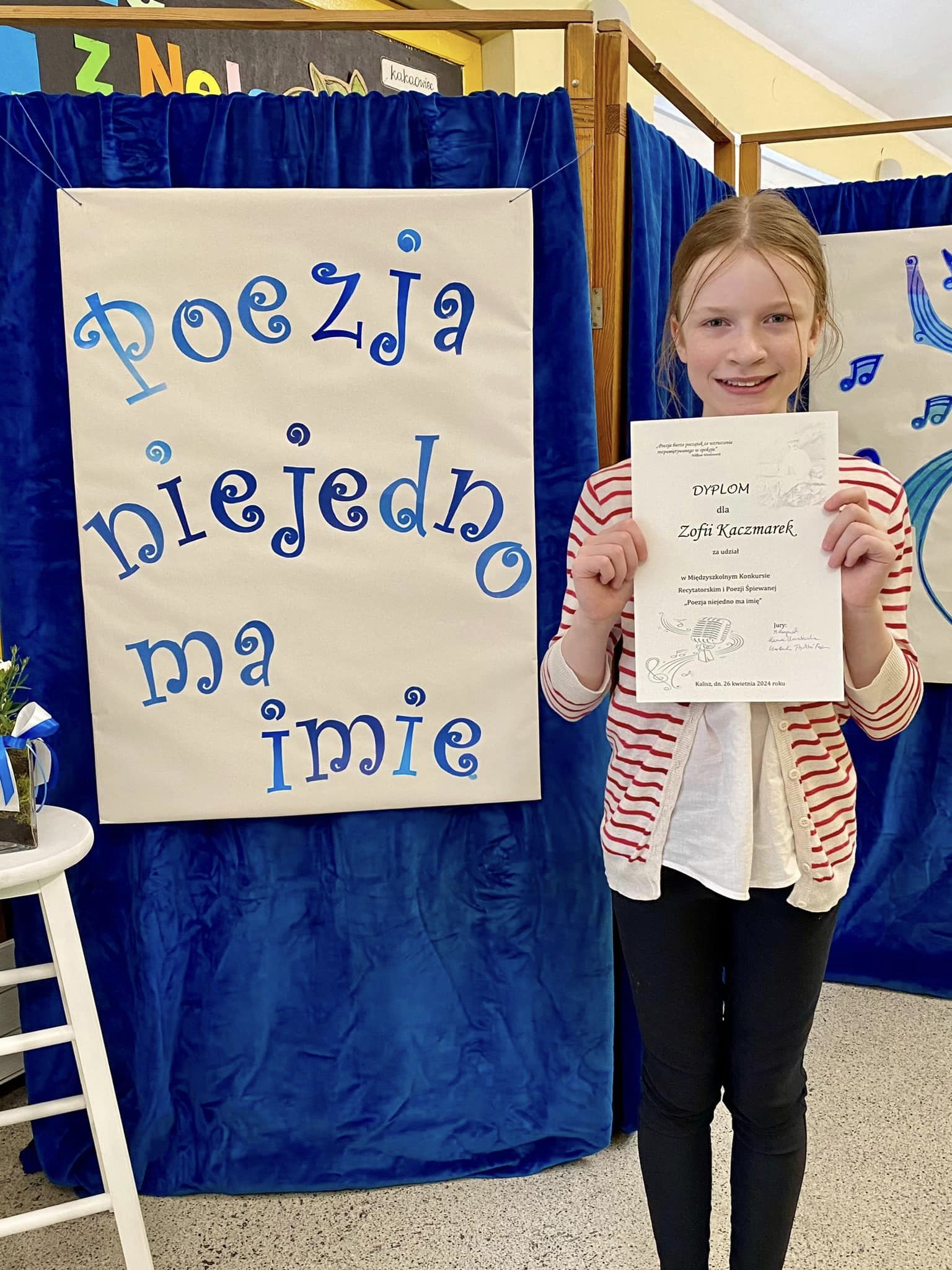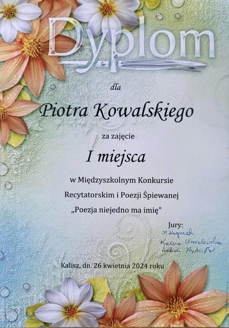 Iga Kołecka z 7a w kategorii klas 7-8 i Piotr Kowalski z 4b wśród uczniów klas 4-6 zwycięzcami Międzyszkolnego Konkursu Recytatorskiego i Poezji Śpiewanej ,,Poezja niejedno ma imię”, organizowanego przez Szkołę Podstawową Nr 17 z Oddziałami Integracyjnymi w Kaliszu oraz Miejską Bibliotekę Publiczną im. Adama Asnyka w Kaliszu. II miejsce w obrębie oddziałów 4-6 zajęła Zofia Słupska z 4b. Naszą szkołę reprezentowała też godnie Zofia Kaczmarek z tej samej klasy. Celem wydarzenia było popularyzowanie twórczości polskich poetów, doskonalenie umiejętności recytatorskich i wokalnych, a także rozbudzanie wrażliwości na piękno poezji i muzyki. Recytatorów oceniało profesjonalne jury złożone m.in. z pani Kamy Kowalewskiej-Kulawinek, która poprowadziła również dla uczestników konkursu warsztaty z inteligencji emocjonalnej. Serdecznie gratulujemy naszym uczniom sukcesu!