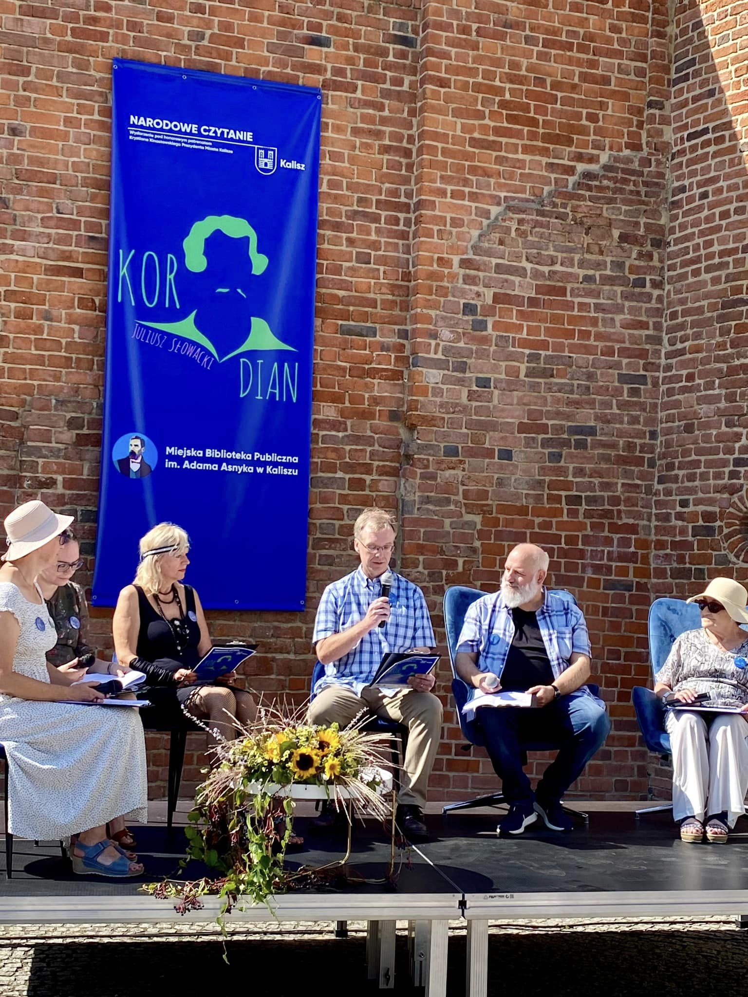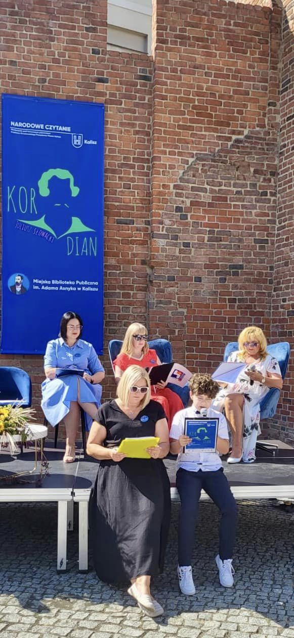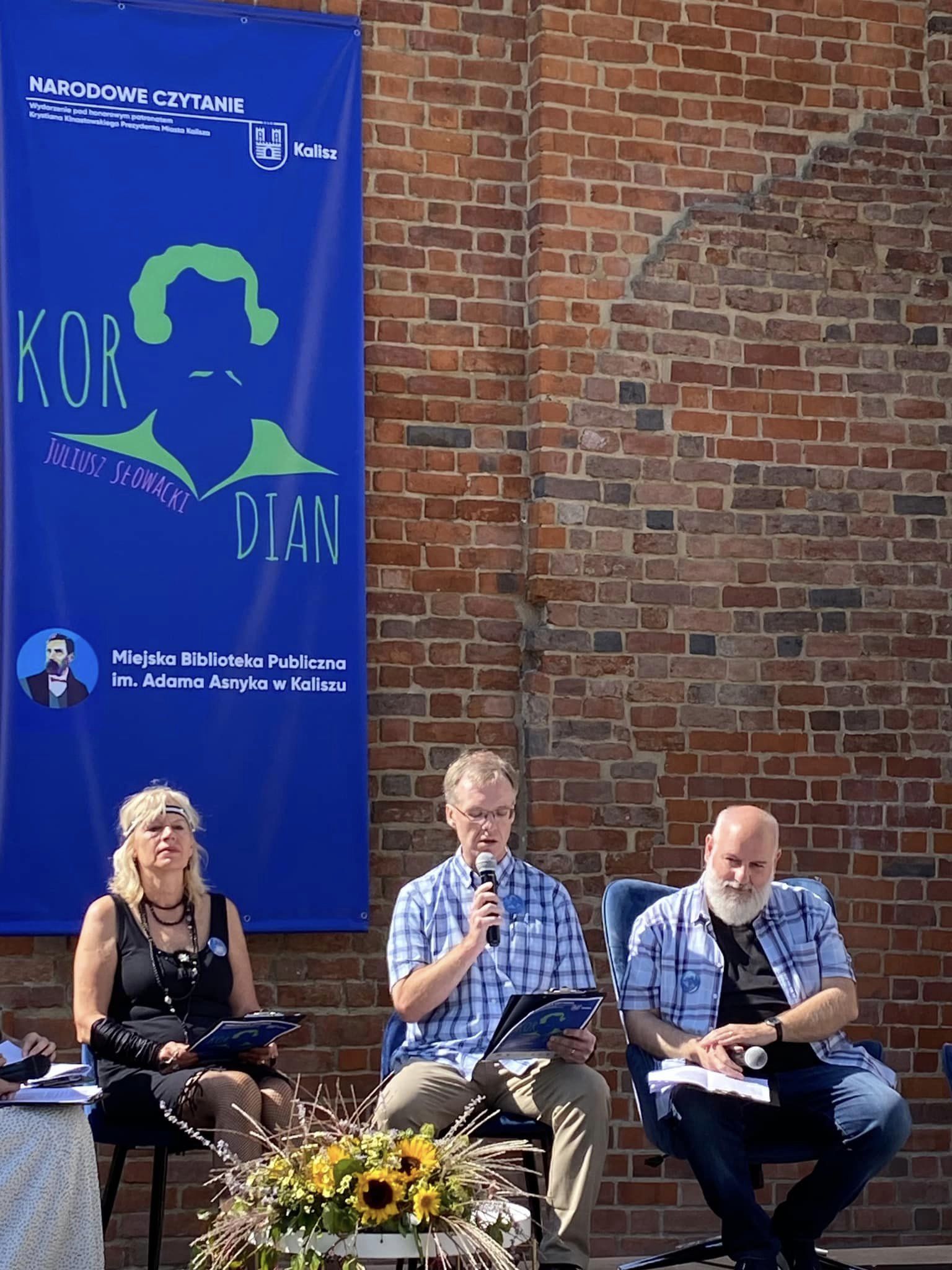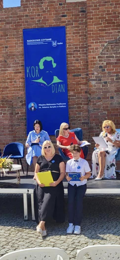 Wczoraj czytaliśmy fragmenty ,,Kordiana” w szkole, a dziś celebrowaliśmy dzieło naszego patrona przed Basztą Dorotką. Do miejskiego Narodowego Czytania 2024 zaprosiła nas Miejska Biblioteka Publiczna im. Adama Asnyka w Kaliszu. W scenie w szpitalu wariatów udział wzięli Piotr Kowalski z klasy 5b oraz pani Małgorzata Olejniczak, nauczycielka języka polskiego. Monolog Kordiana na Mont Blanc w języku angielskim czytał Paul Hacking, nasz native speaker w klasach dwujęzycznych.